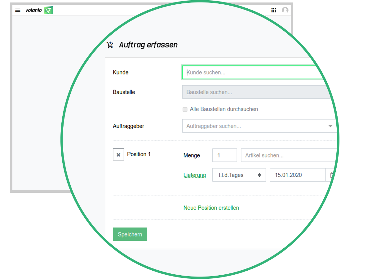 Mit der Volanio Auftragserfassung bist du für dein Tagesgeschäft gut gerüstet, um Aufträge am Telefon direkt und fehlerfrei anzulegen. Denn fehlende Stammdaten wie Kunden, Baustellen, Kontaktdaten oder Artikel können in der gleichen Maske mit erfasst werden.